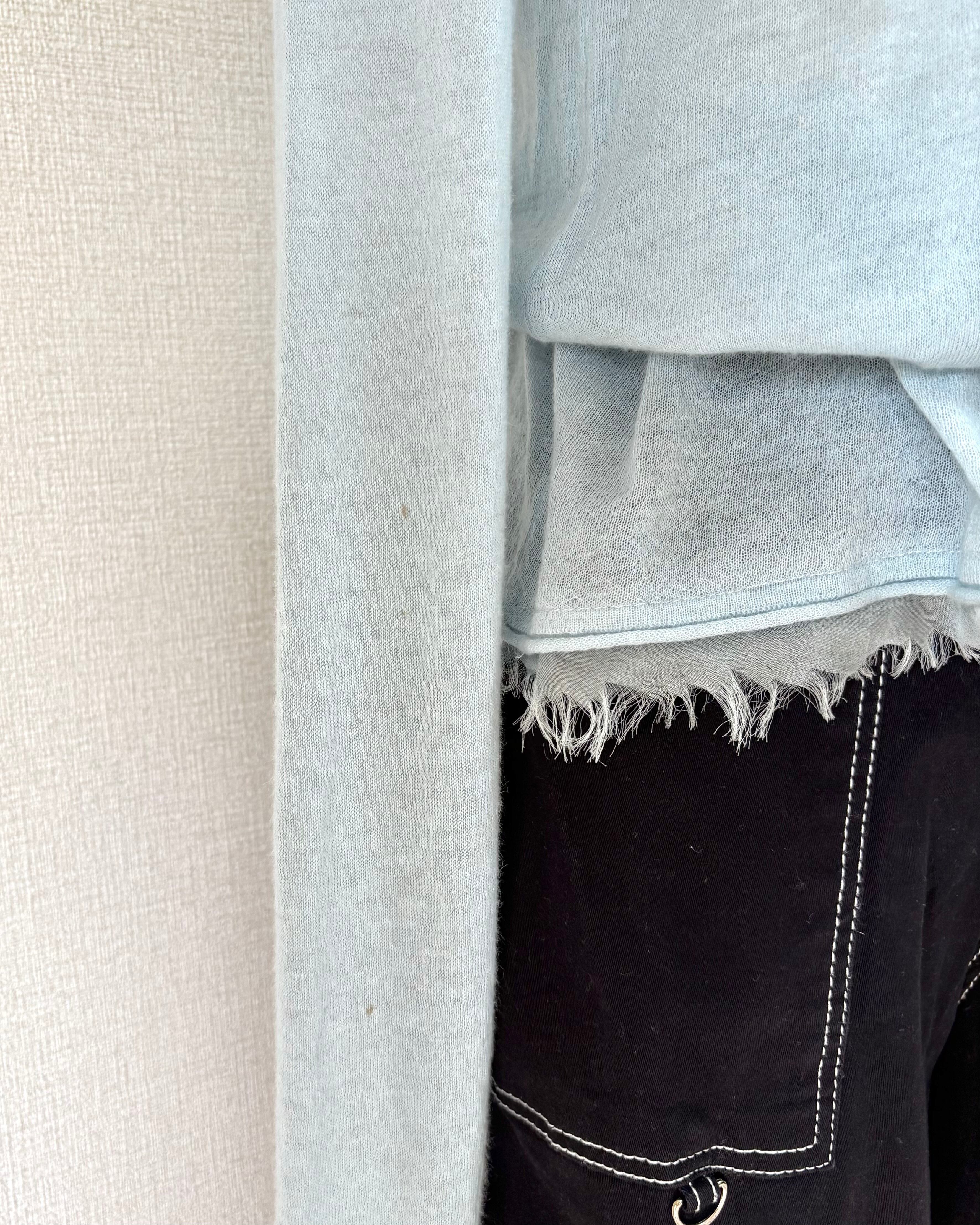 ほんのりと肌が透ける、アイスブルー色の薄手のニット