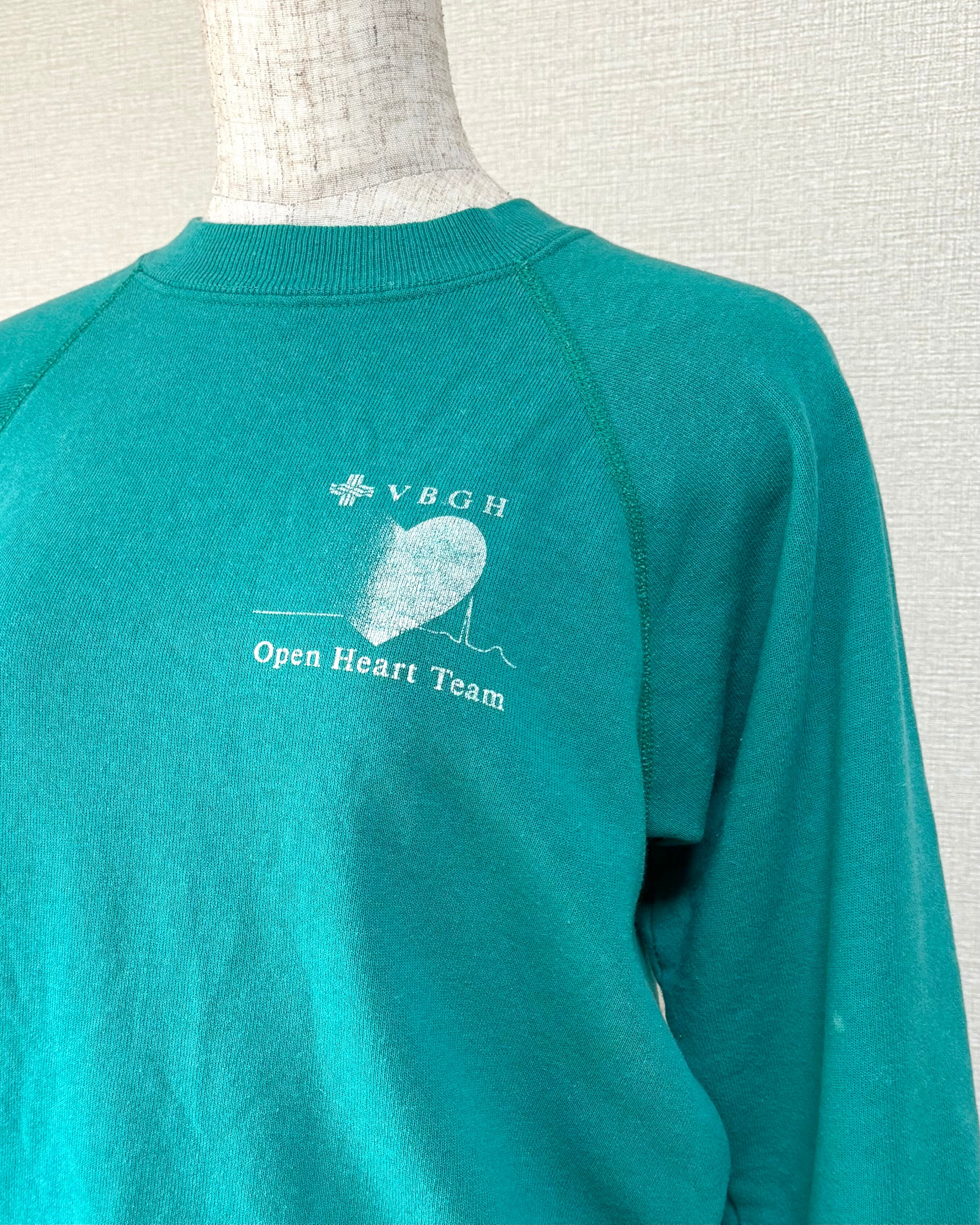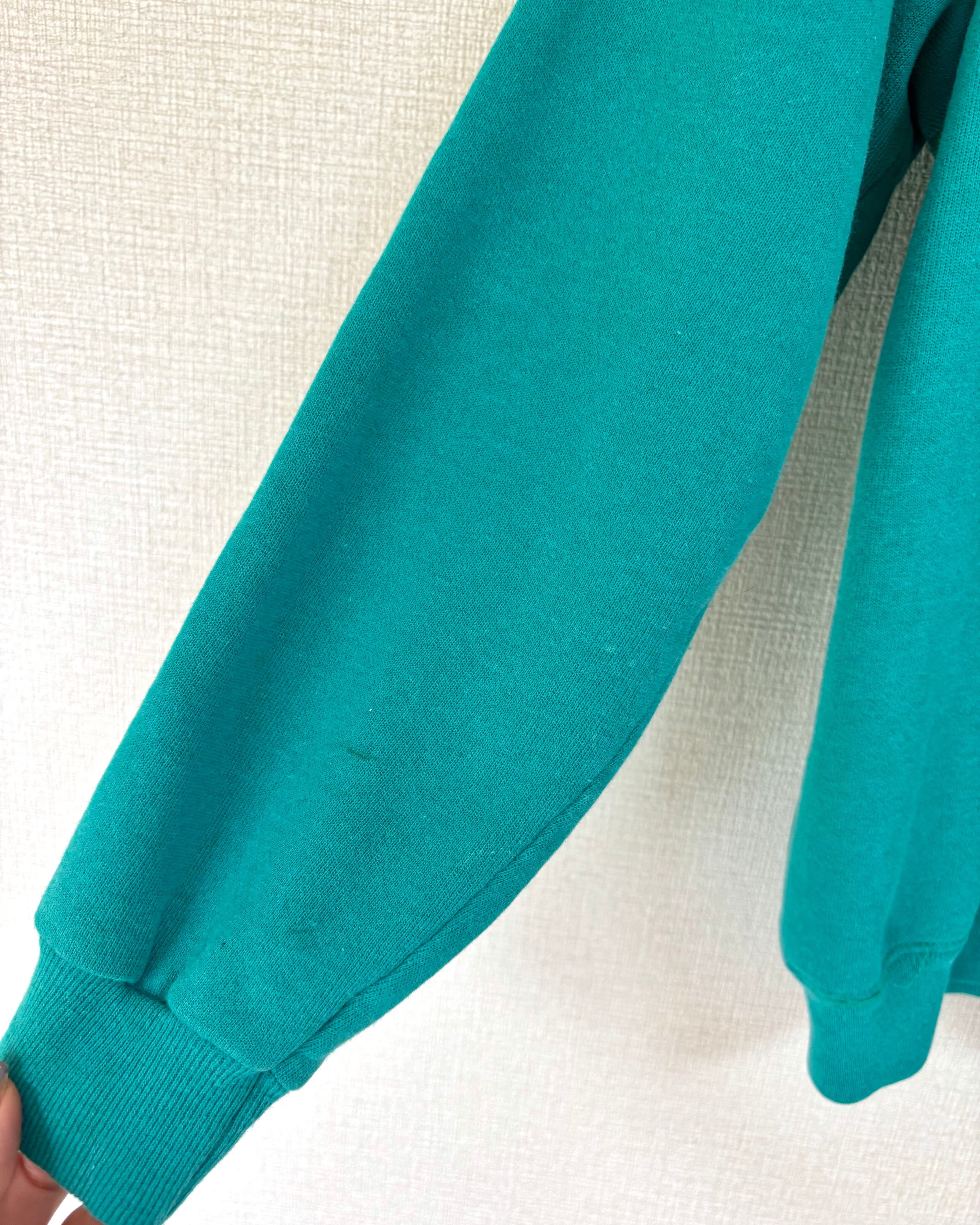 エメラルドグリーンに、ホワイトの胸プリントとバックプリントが目を引くスウェット