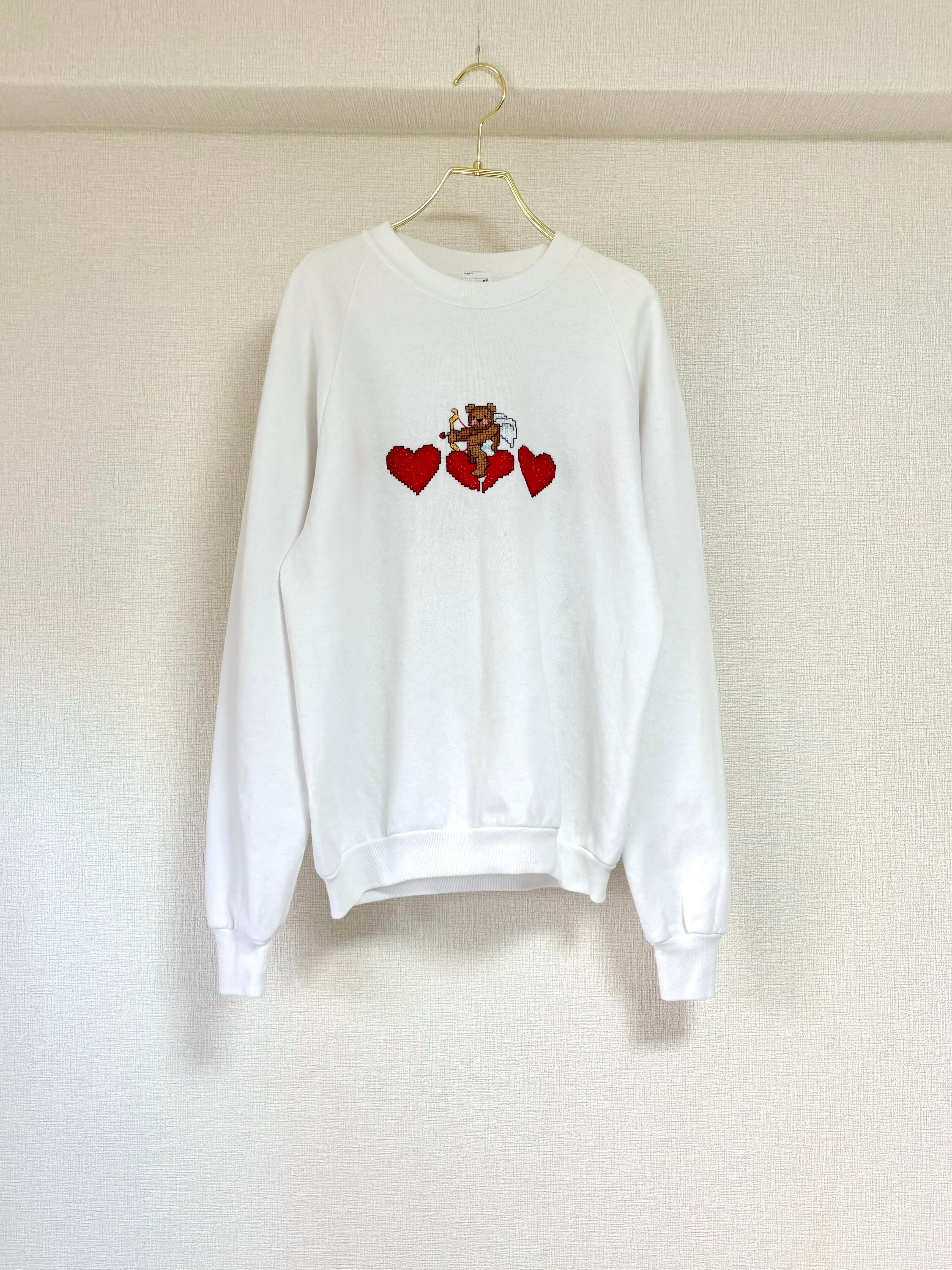 クロスステッチ刺繍で描かれたキューピッドのくまが可愛らしいスウェットです