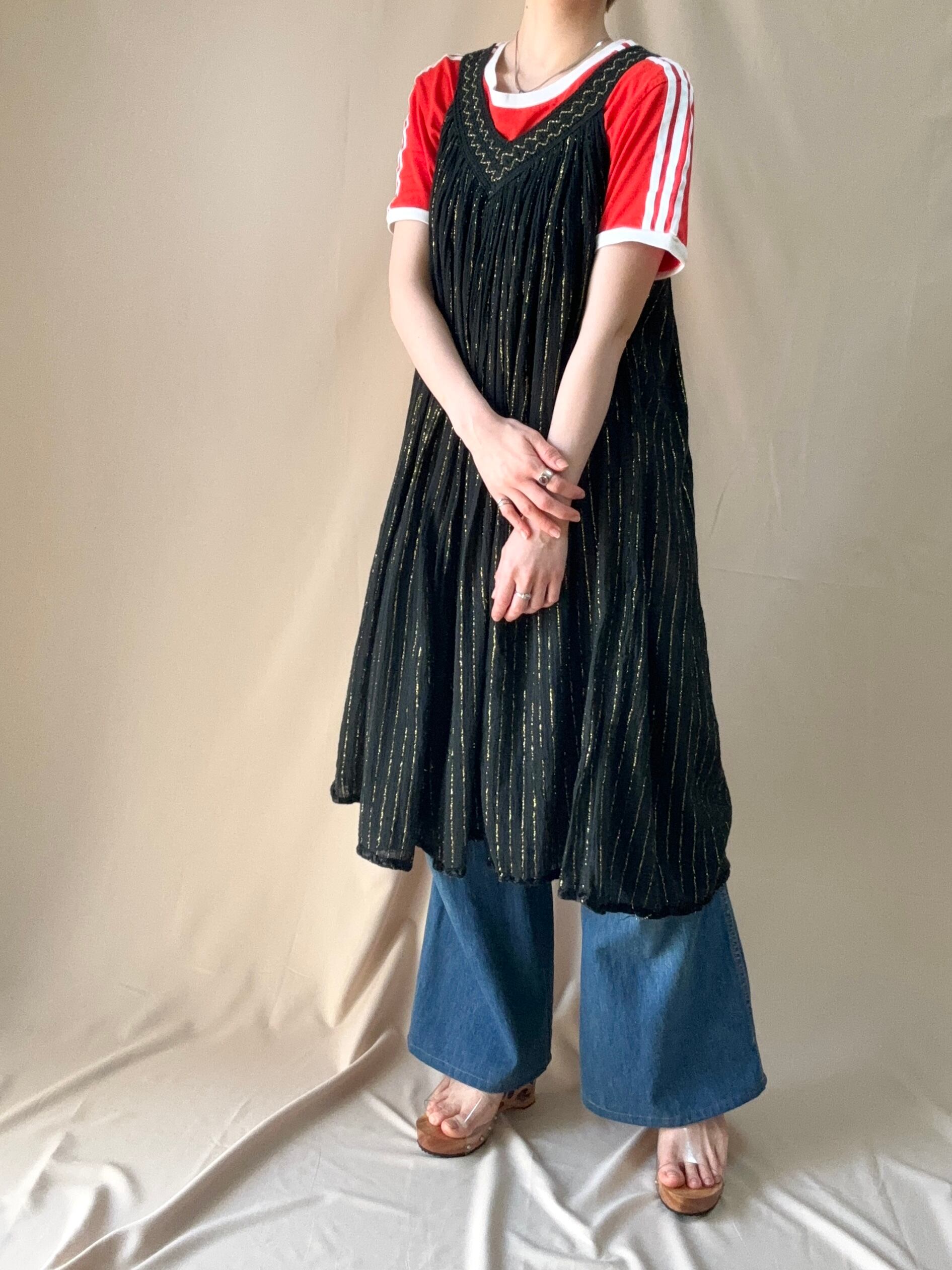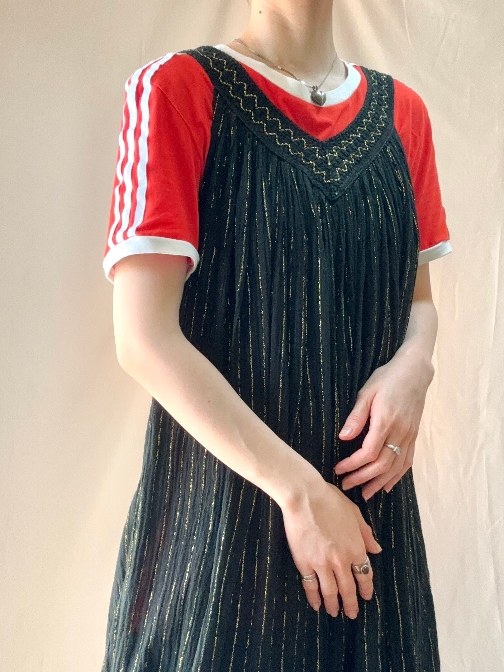 ゴールドのグリッター糸が輝くギリシャワンピース