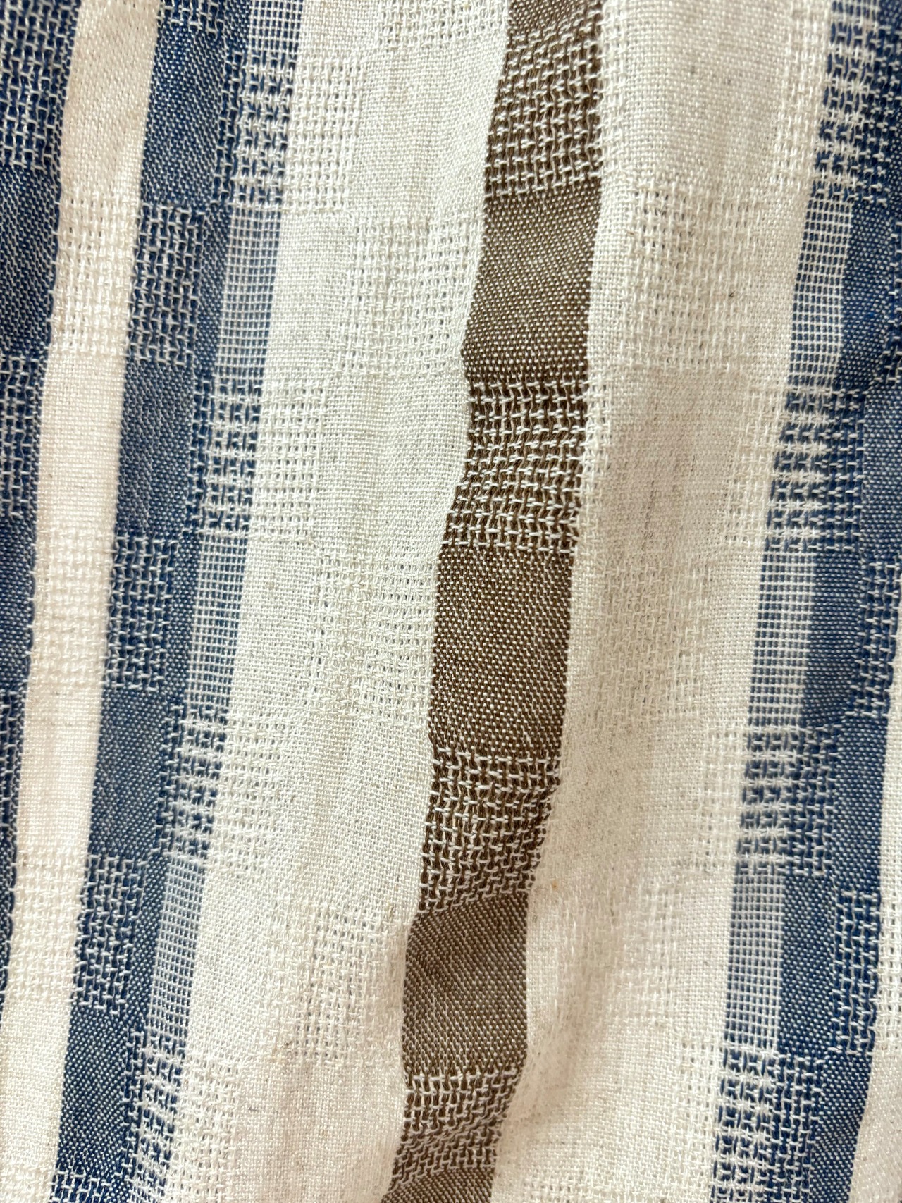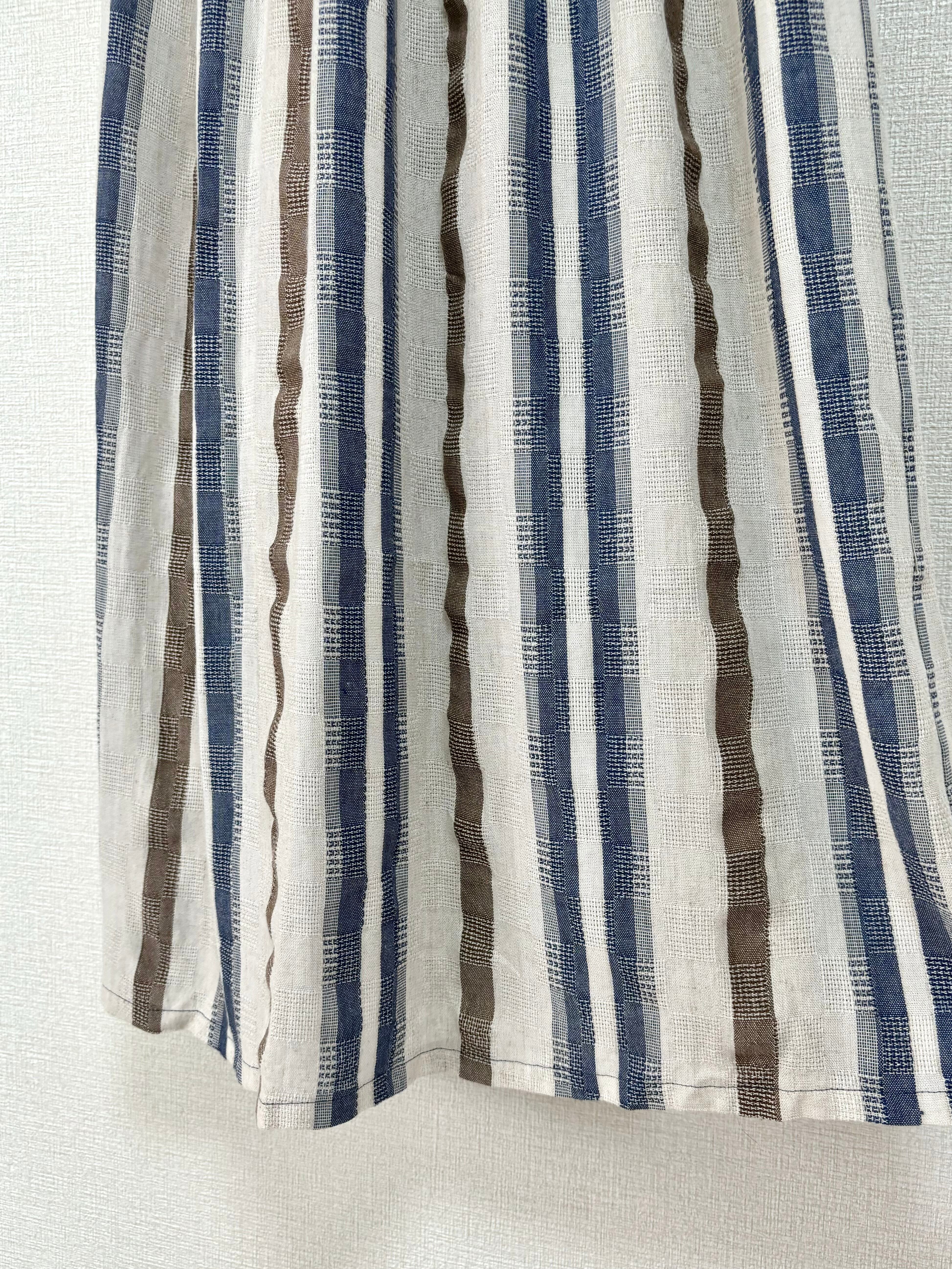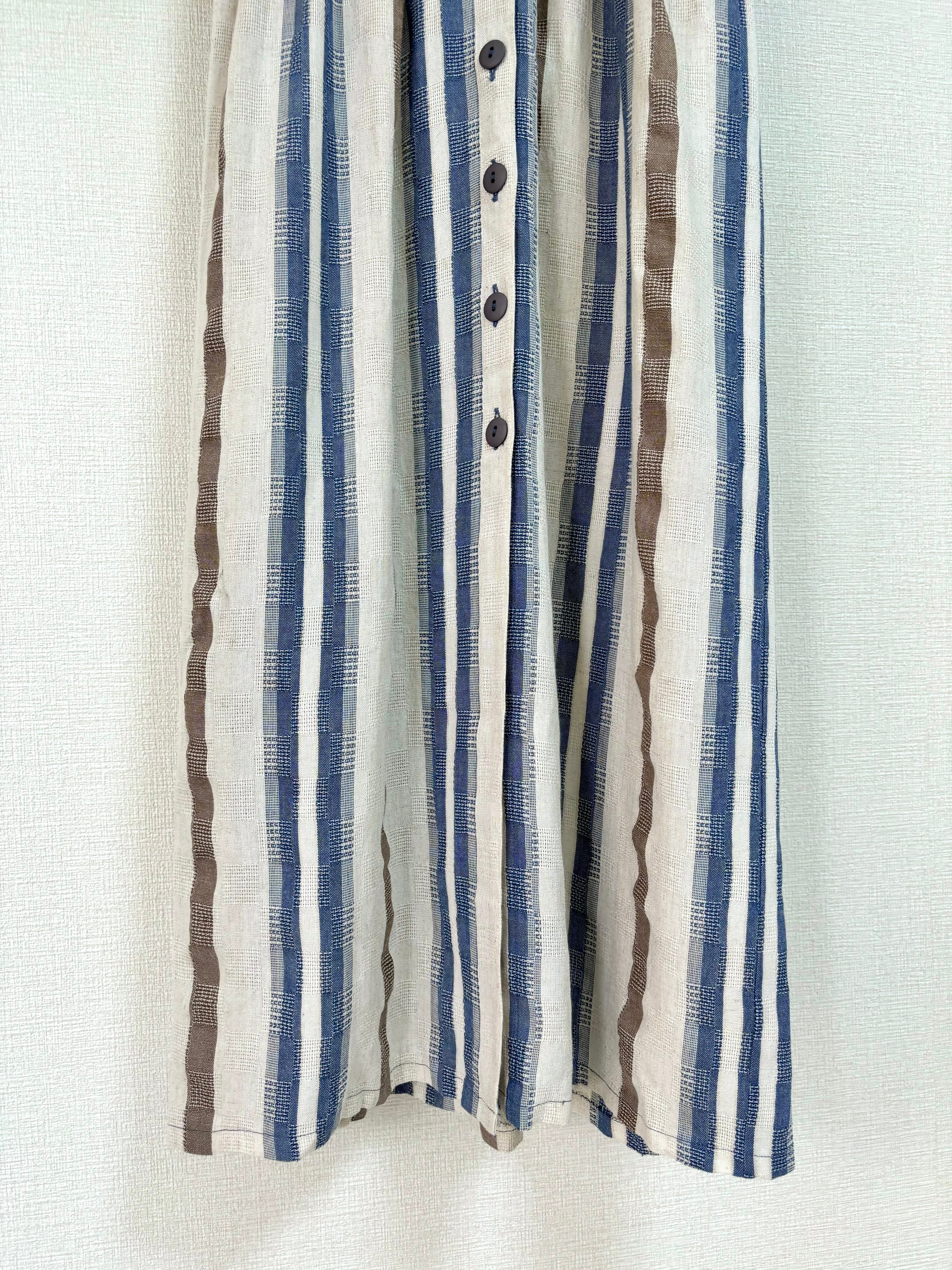 こっくりとしたブルーとストライプ柄が印象的なワンピース。