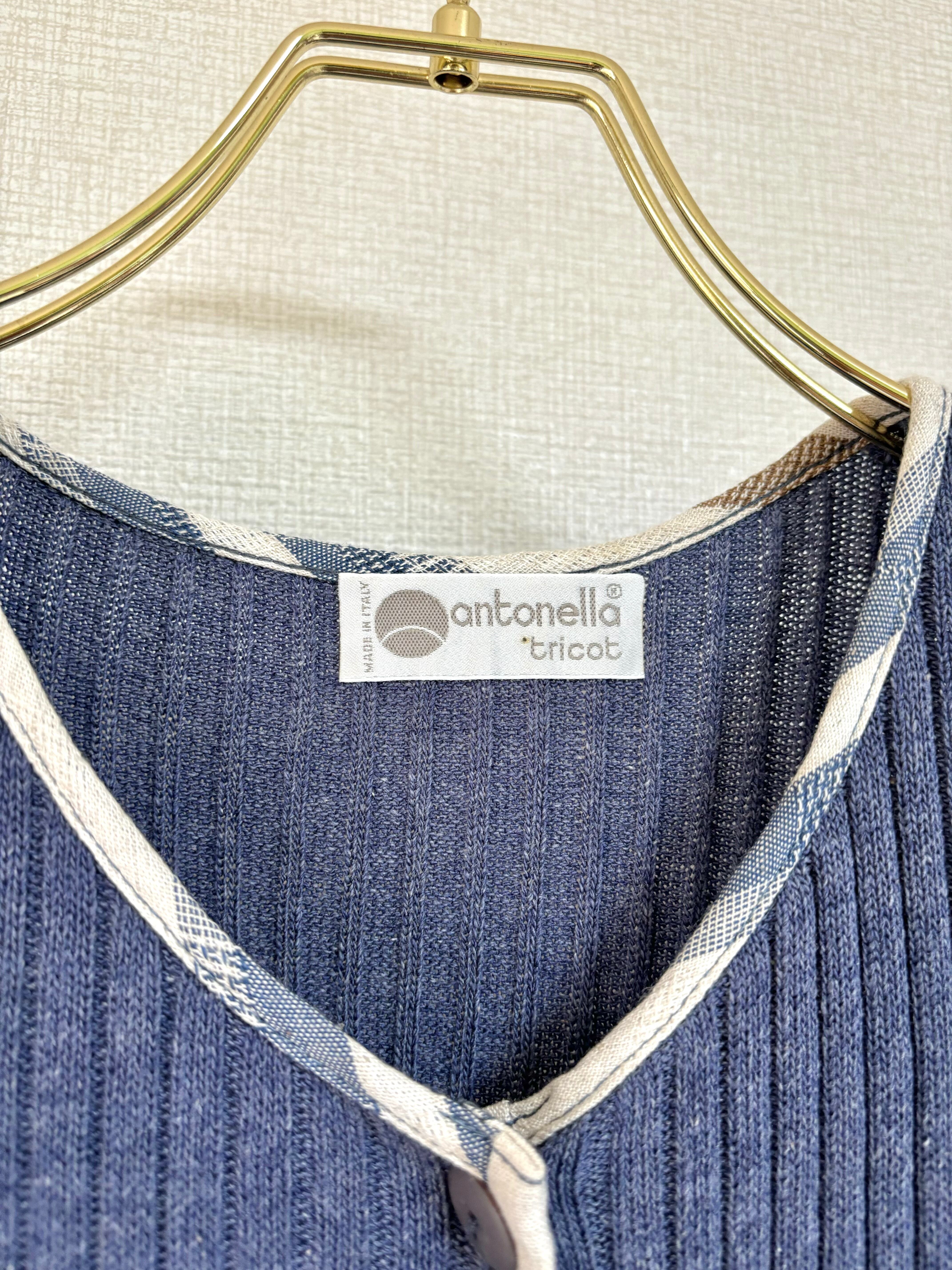 トップス部分はブルーのリブニット、スカート部分はレーヨン×リネンのさらりとした素材で仕立てられています。