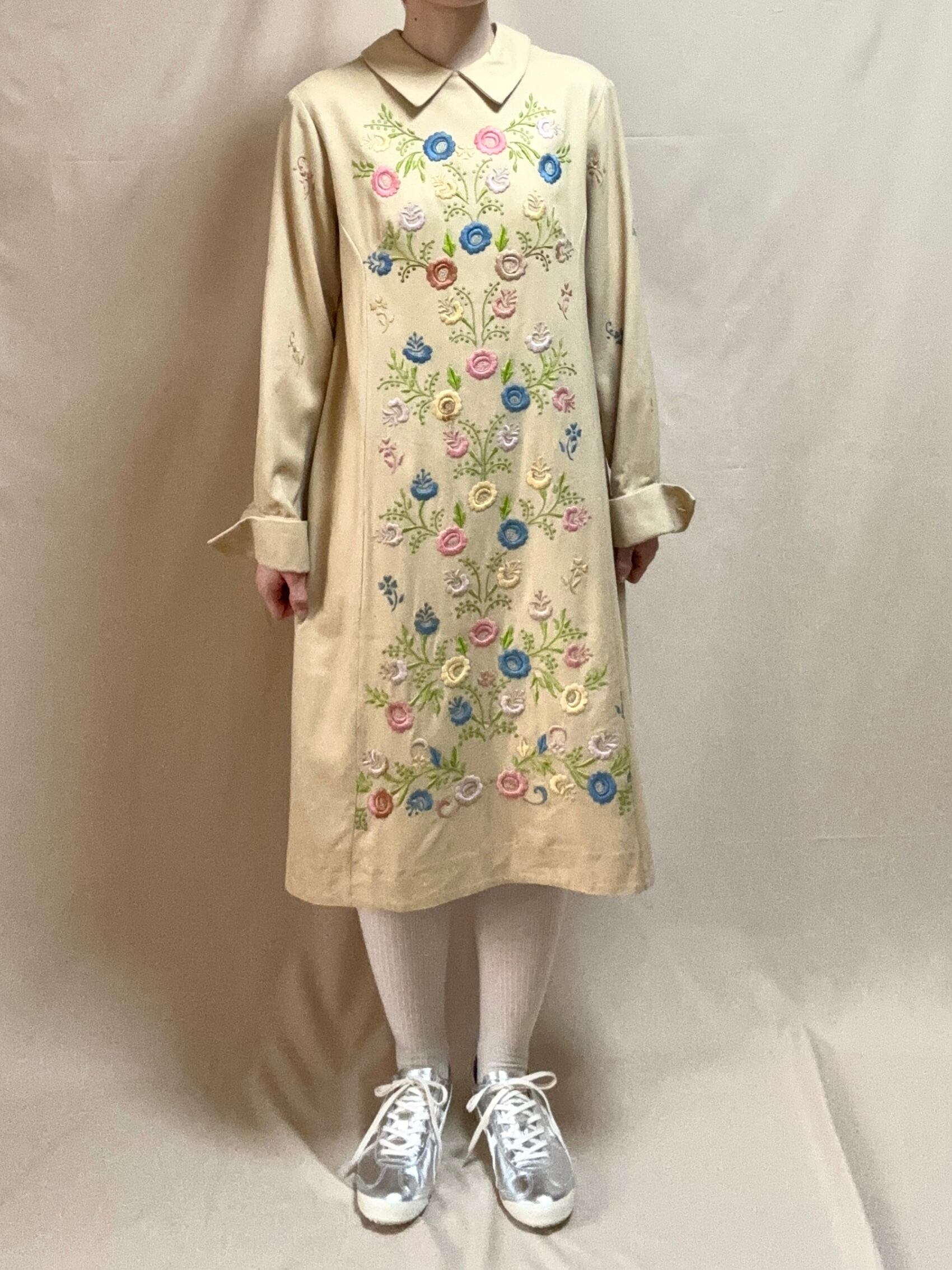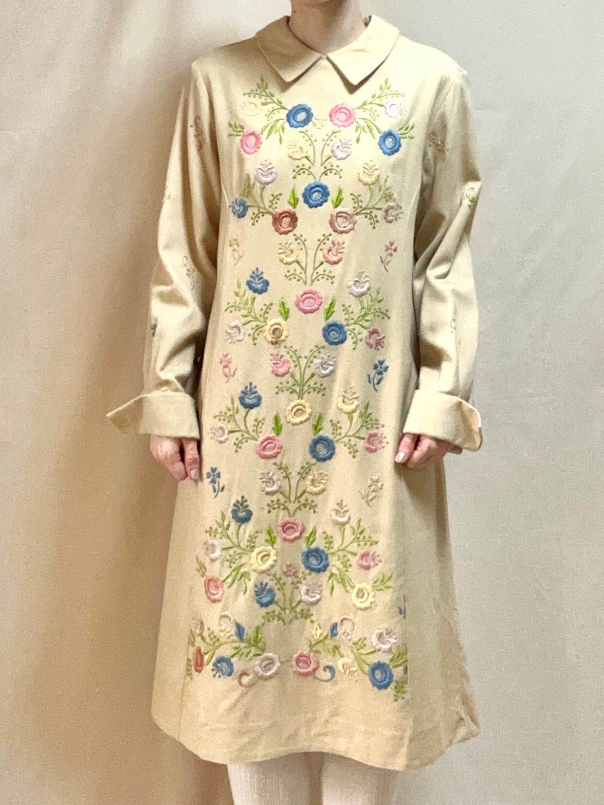 上品なライトベージュのボディに、色とりどりのお花の刺繍ほどこされたとってもきれいなドレスです。