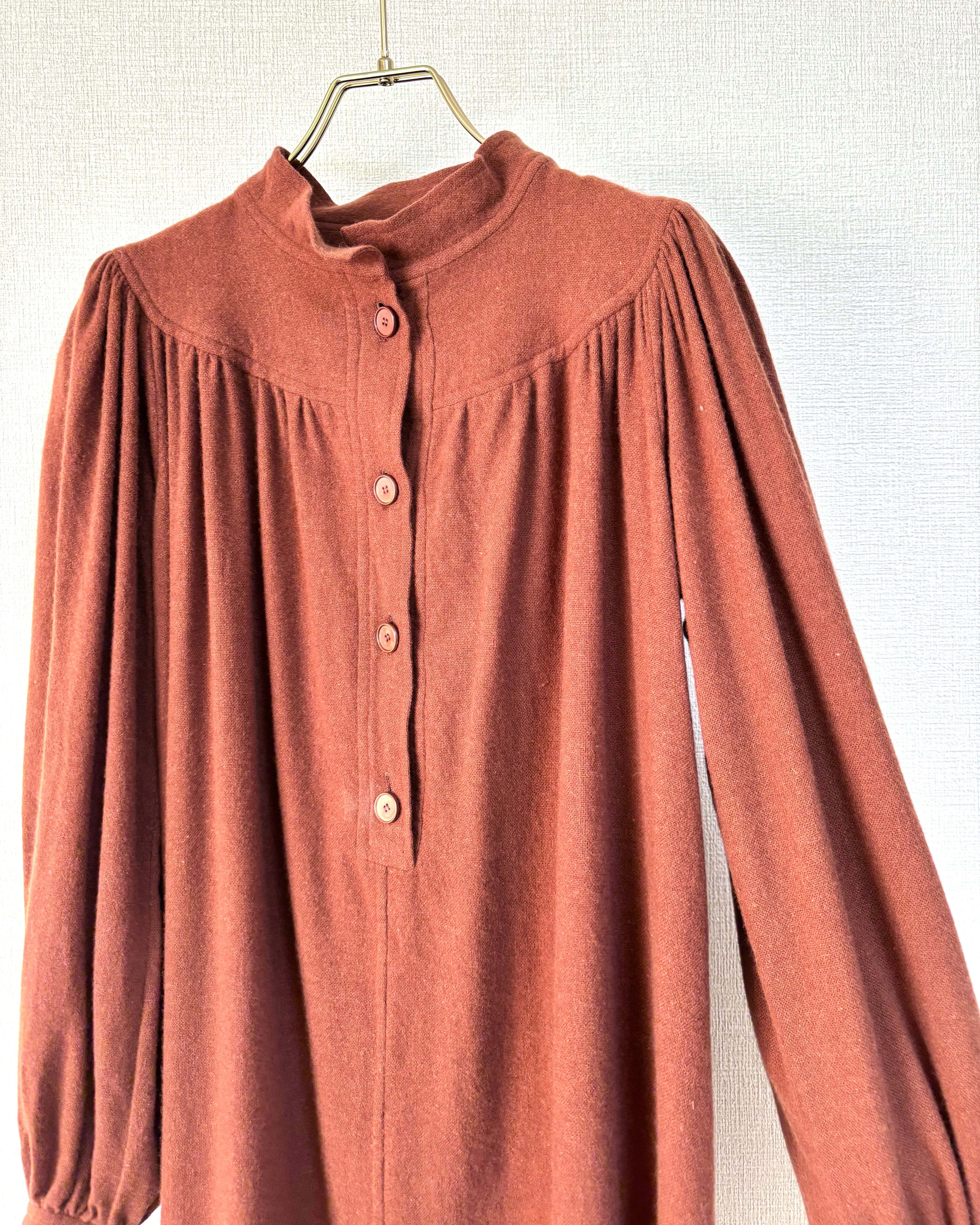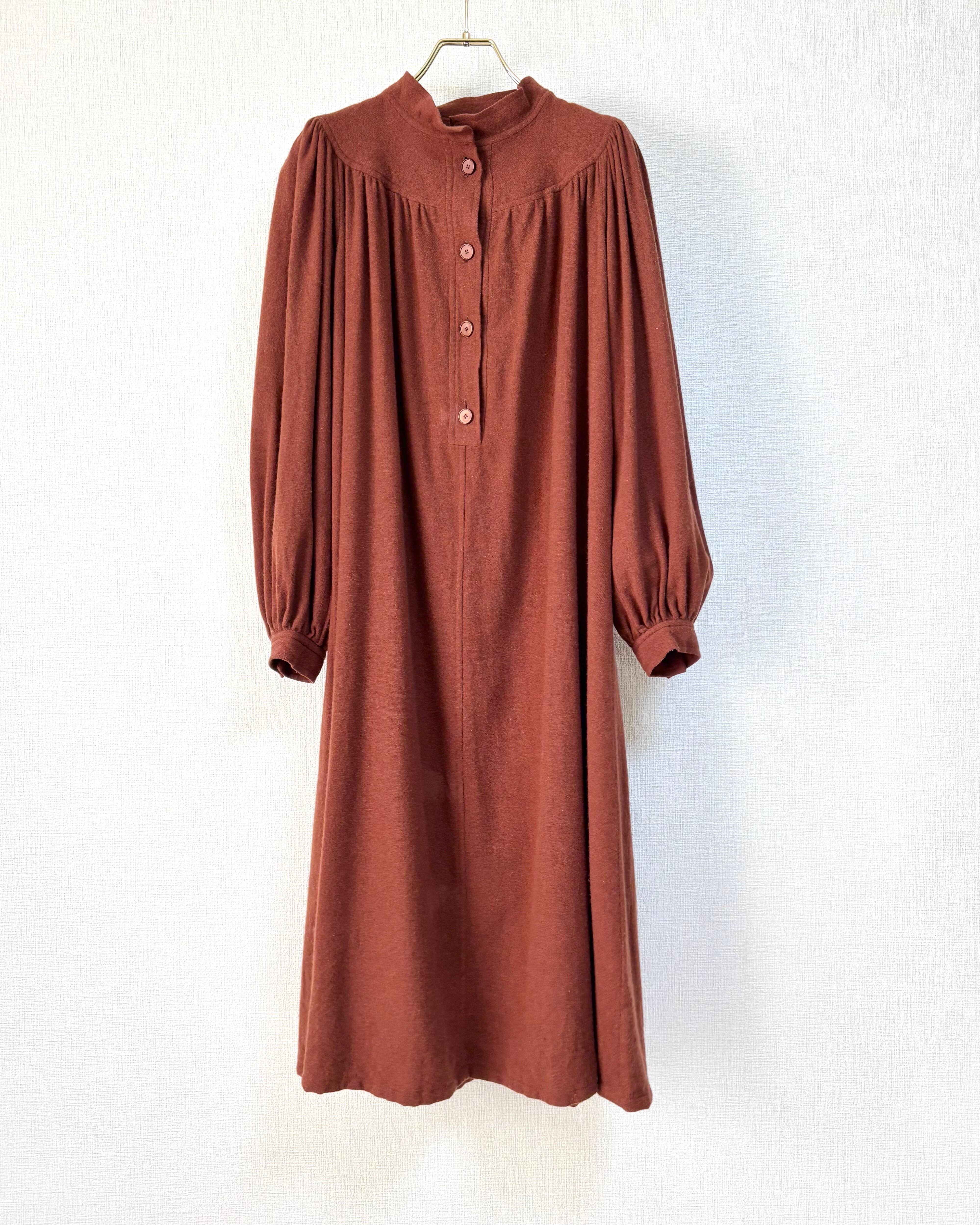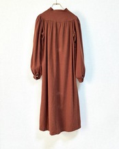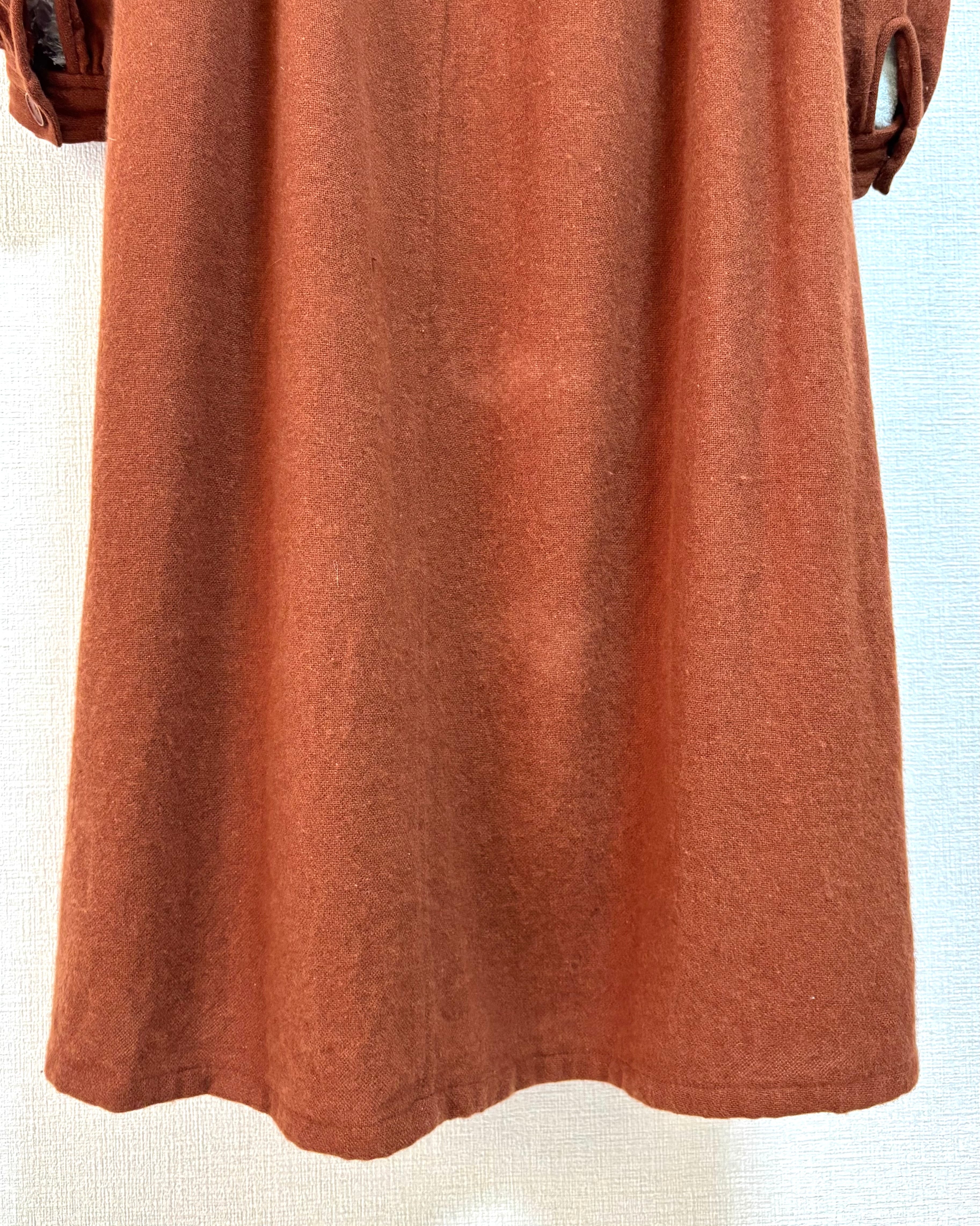 オレンジとブラウンの中間のような、温かみのあるテラコッタカラーが素敵なドレス。