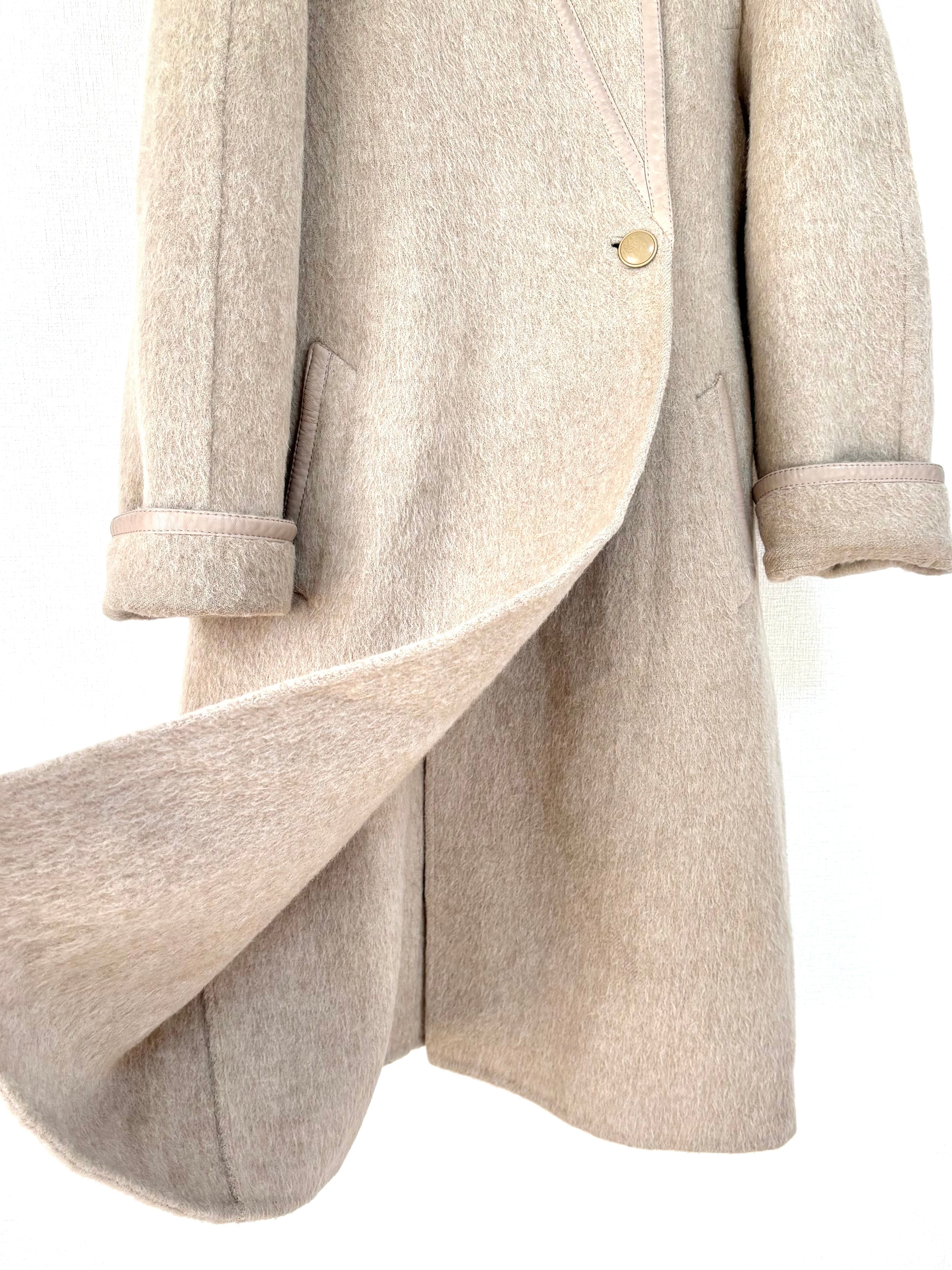 上品なグレイッシュベージュ色が印象的なロングコート。